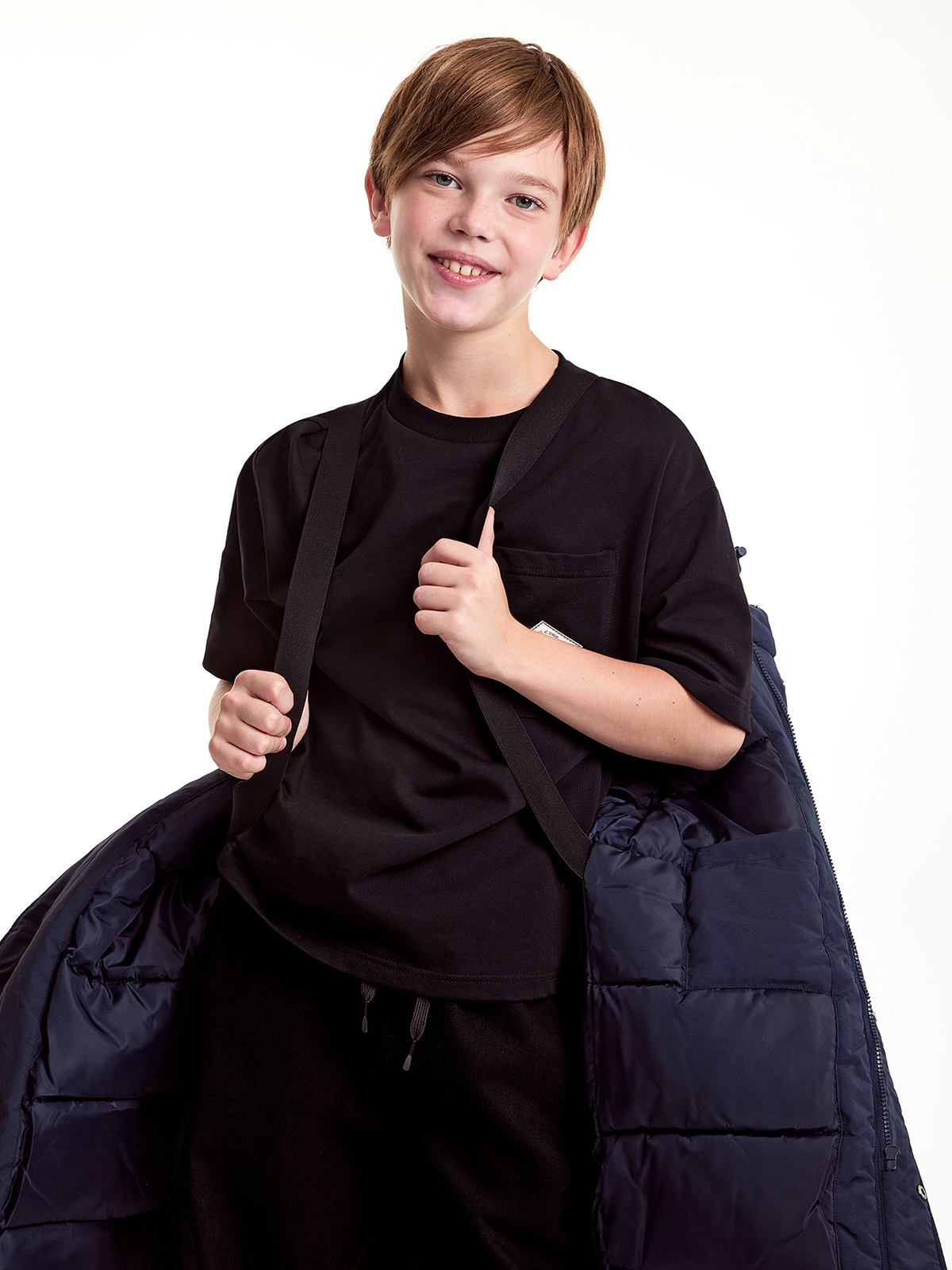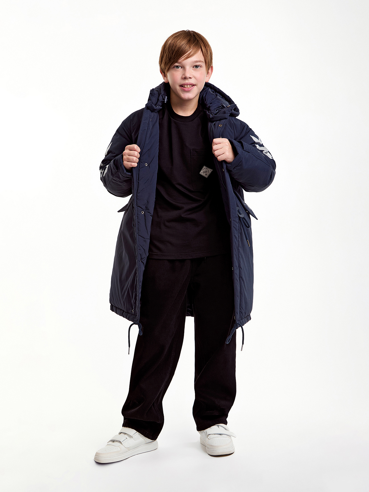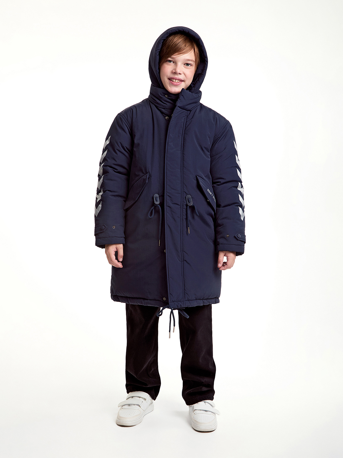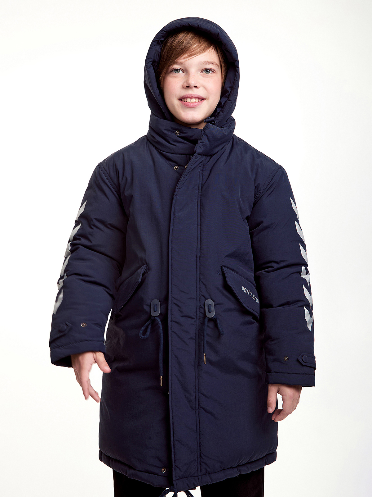 Зимнее пальто для мальчиков с водонепроницаемым покрытием прямого силуэта. Съемный капюшон с утяжкой, воротник-стойка, ветрозащитная планка на кнопках и застежка-молния. Изделие дополнено утяжками на поясе. Лямки с внутренней стороны куртки. Карманы с подкладкой на флисе и с надписью «DON`T STOP». Манжет рукава из ткани ""Soft Stretch"" с прочной внешней поверхностью и мягким внутренним слоем с велюровым ворсом. На спинке по низу изделия и на рукавах пальто оформлено светоотражающими элементами.