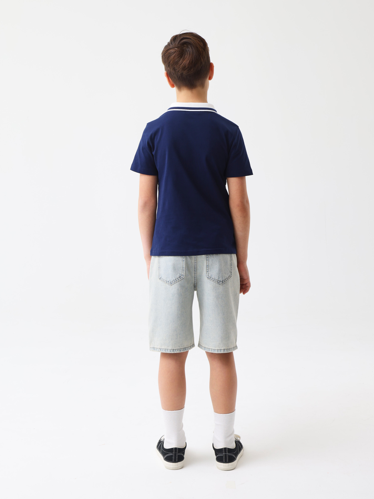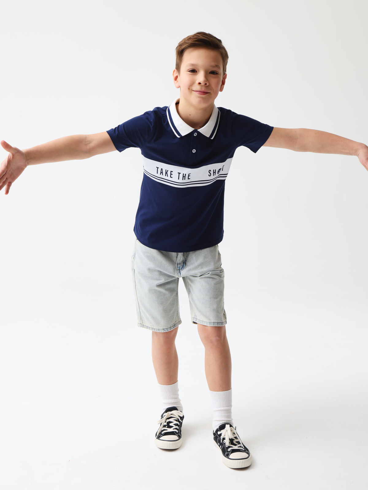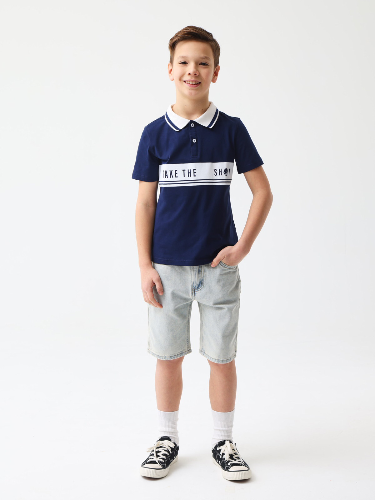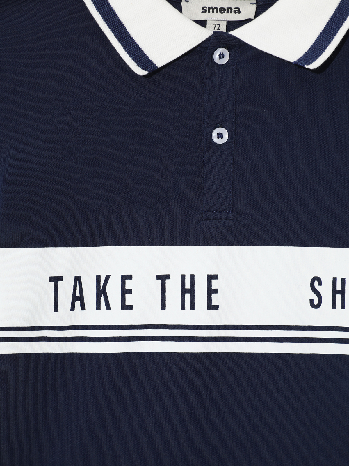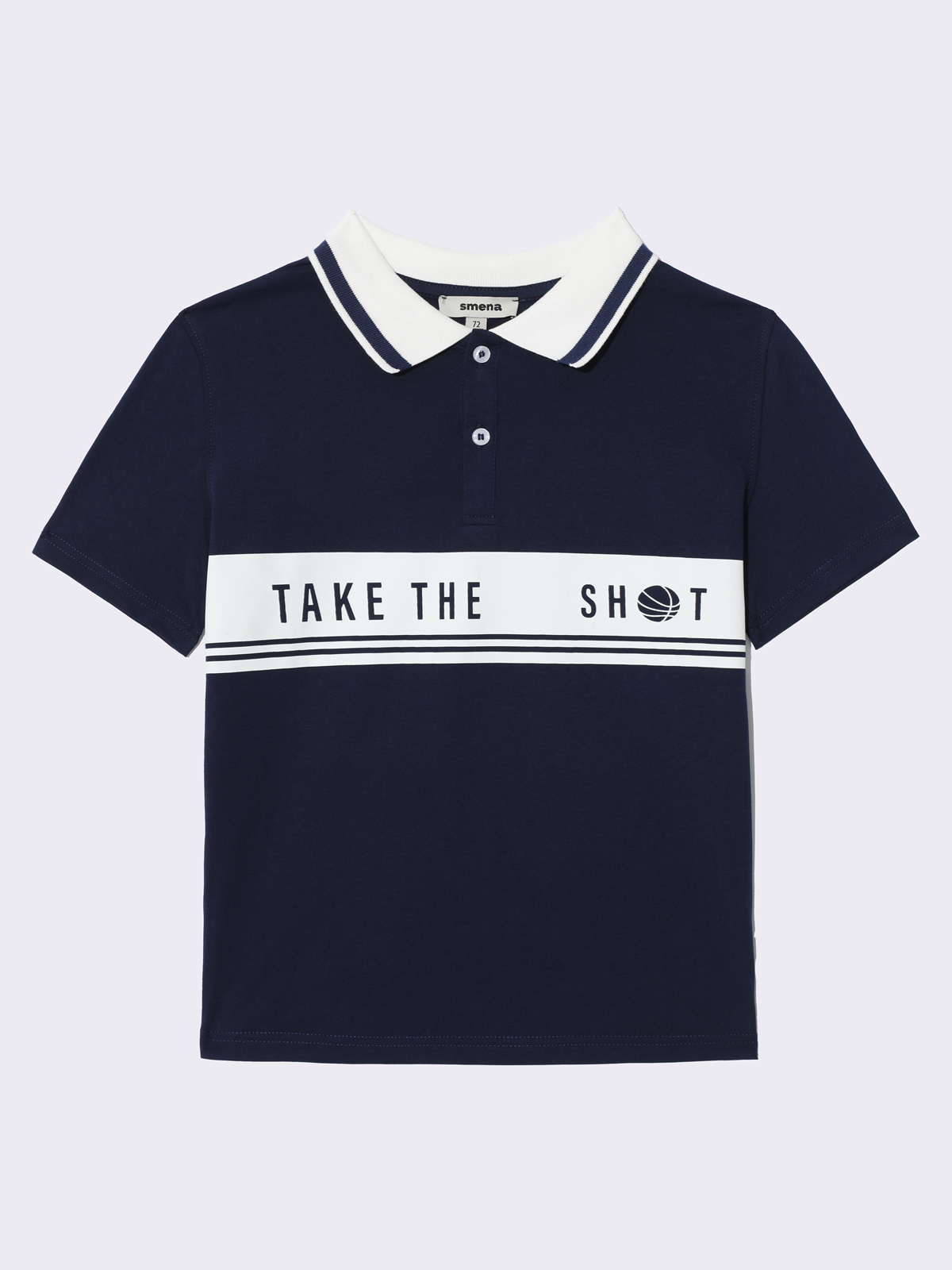 Трикотажное поло с короткими рукавами. Мягкий фактурный трикотаж из 100% хлопка. Классический прямой крой, отложной воротник, планка на двух пуговицах. В верхней части контрастный принт TAKE THE SHOT (с англ. «баскетбол сделай бросок»).