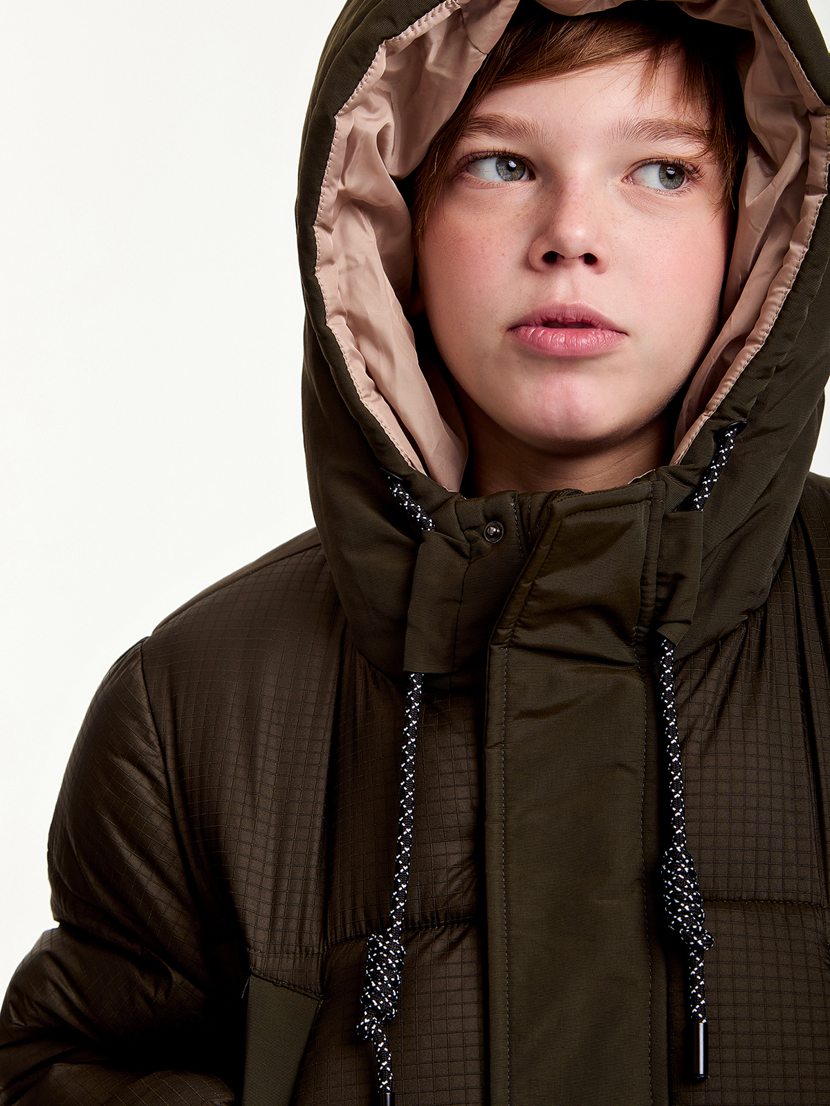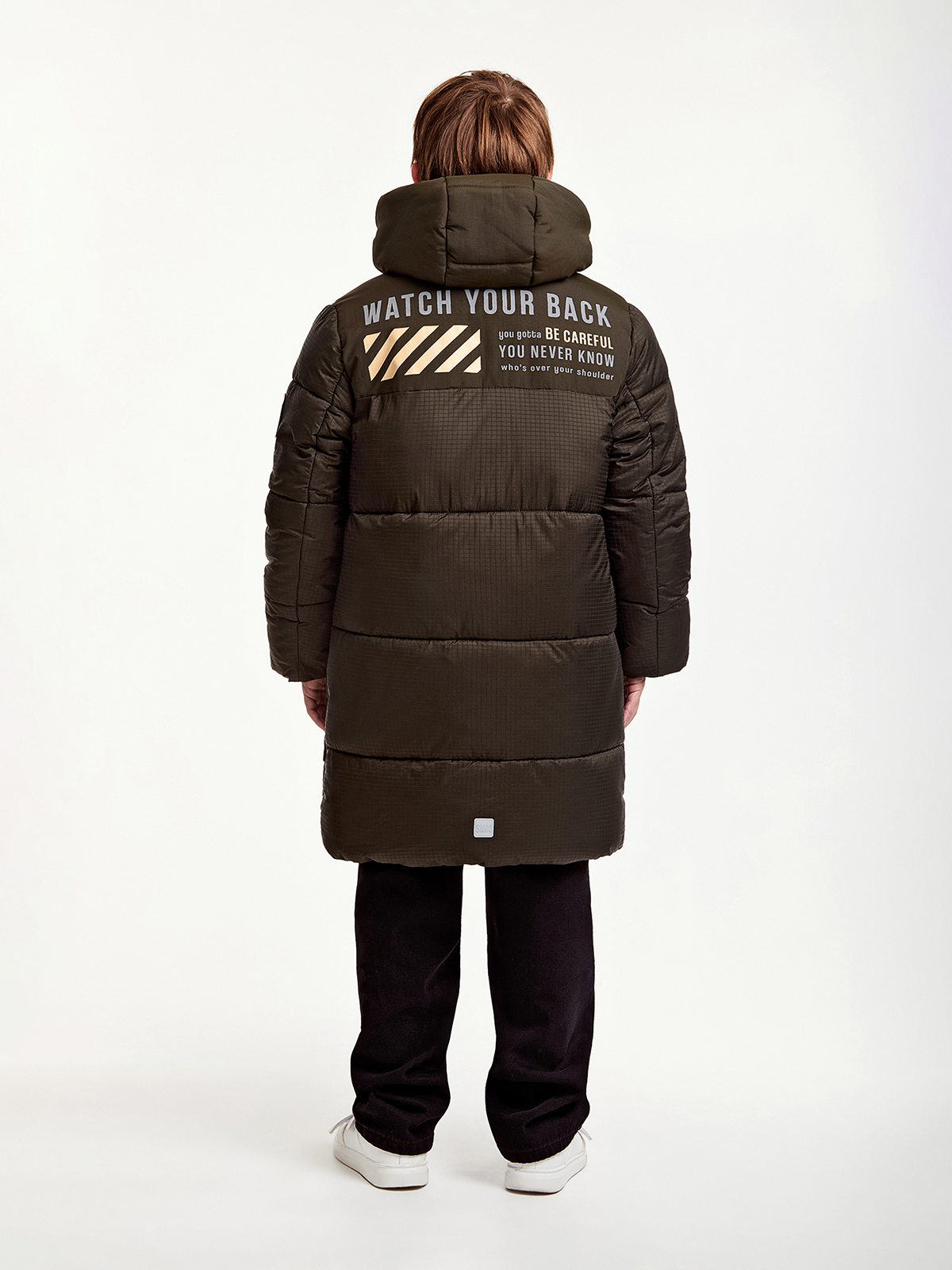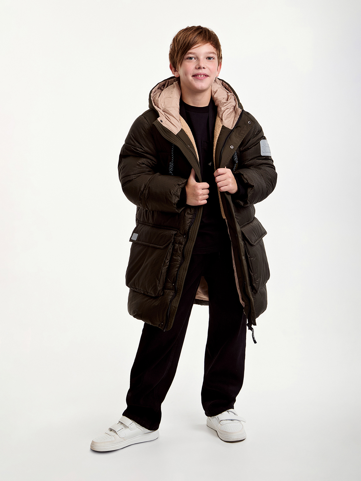 Объем куртки по талии можно регулировать шнурком на кулиске, для корректировки размера и комфортной посадки. Куртка также имеет удобные лямки-бретели, которые позволяют снимать ее и носить на спине как рюкзак при входе в помещение. Верхняя часть подкладки выполнена из искусственного меха для дополнительного тепла и комфорта.